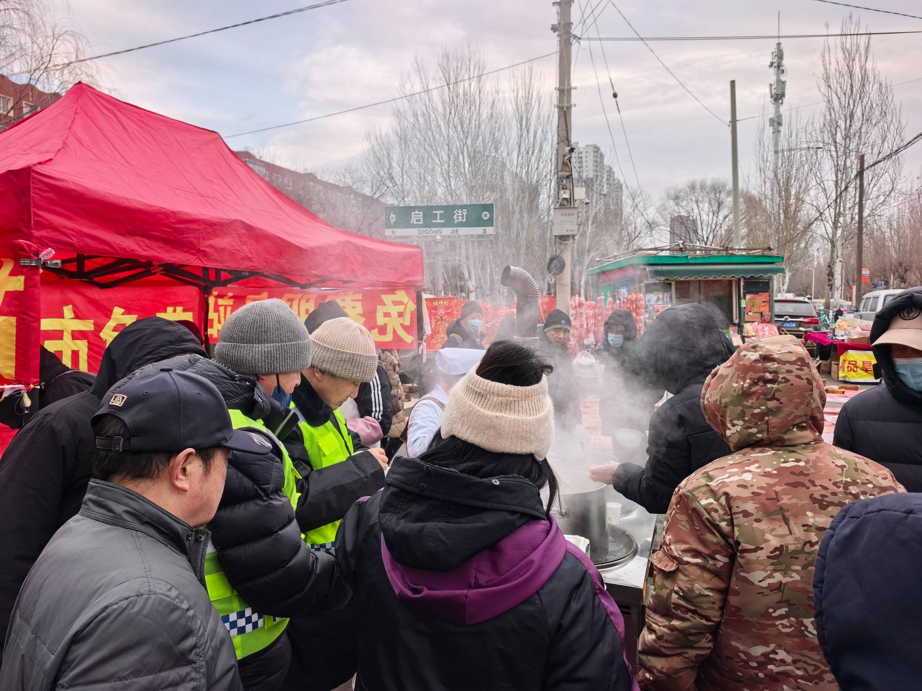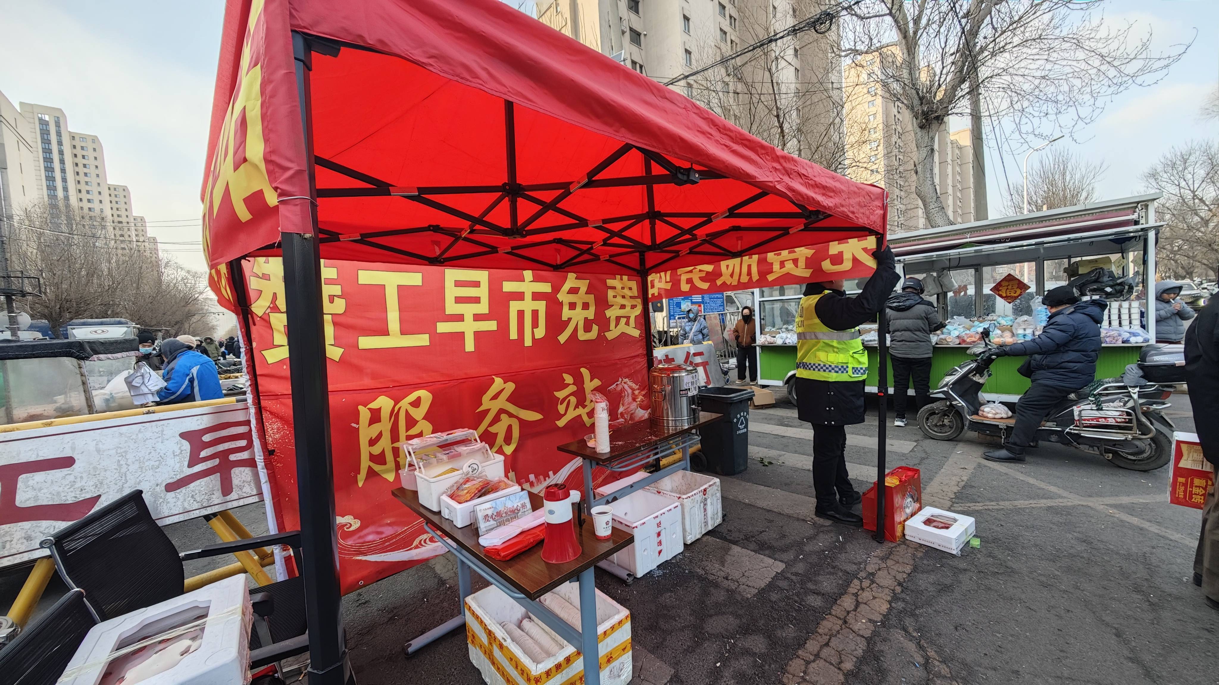 春节前夕,沈阳市铁西区赞工早市便民服务措施再次升级,由过去的室内“游客驿站”升级为室外的便民服务中心,扩大服务范围和服务对象,增加便民服务项目和服务功能,为游客和市民免费提供的粥、现磨豆浆和红糖姜水等热饮热食,同时也设立了应急药箱,塑料袋,充气筒,爱心暖宝,免费寄存等多项服务。
